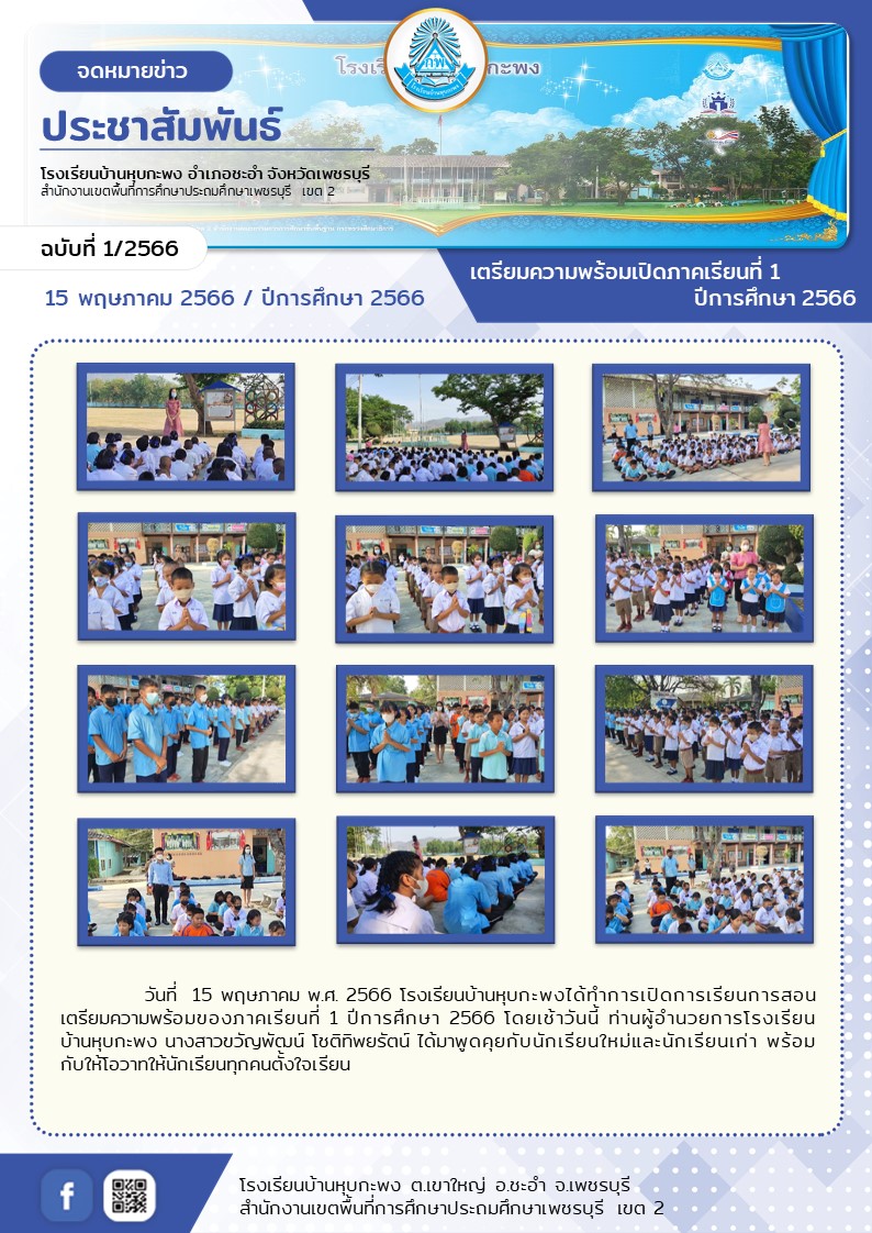 วันที่ 15 พฤษภาคม พ.ศ. 2566 โรงเรียนบ้านหุบกะพงได้ทำการเปิดการเรียนการสอน เตรียมความพร้อมของภาคเรียนที่ 1 ปีการศึกษา 2566 โดยเช้าวันนี้ ท่านผู้อำนวยการโรงเรียน บ้านหุบกะพง นางสาวขวัญพัฒน์ โชติทิพยรัตน์ ได้มาพูดคุยกับนักเรียนใหม่และนักเรียนเก่า พร้อมกับให้โอวาทให้นักเรียนทุกคนตั้งใจเรียน
