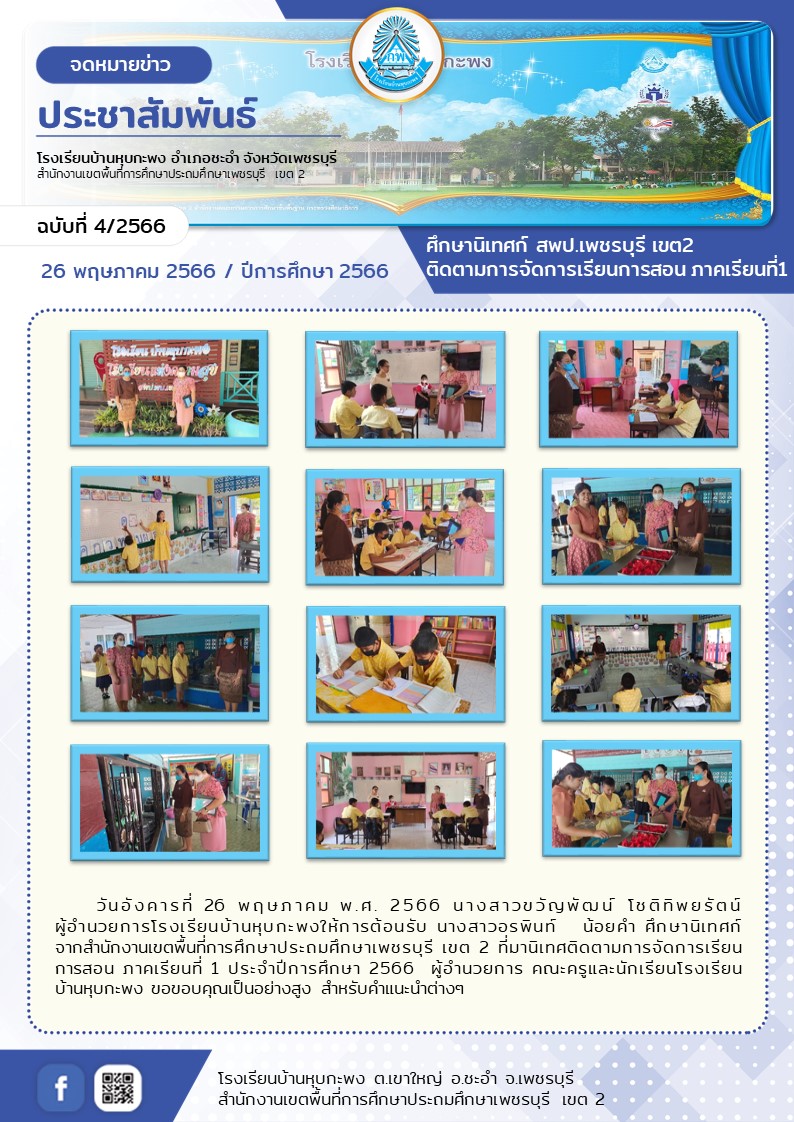 วันศุกร์ที่ 26 พฤษภาคม พ.ศ. 2566 นางสาวขวัญพัฒน์ โชติทิพยรัตน์ ผู้อำนวยการโรงเรียนบ้านหุบกะพงให้การต้อนรับ นางสาวอรพินท์ น้อยคำ ศึกษานิเทศก์ จากสำนักงานเขตพื้นที่การศึกษาประถมศึกษาเพชรบุรี เขต 2 ที่มานิเทศติดตามการจัดการเรียน การสอน ภาคเรียนที่ 1 ประจำปีการศึกษา 2566 ผู้อำนวยการ คณะครูและนักเรียนโรงเรียนบ้านหุบกะพง ขอขอบคุณเป็นอย่างสูง สำหรับคำแนะนำต่างๆ
