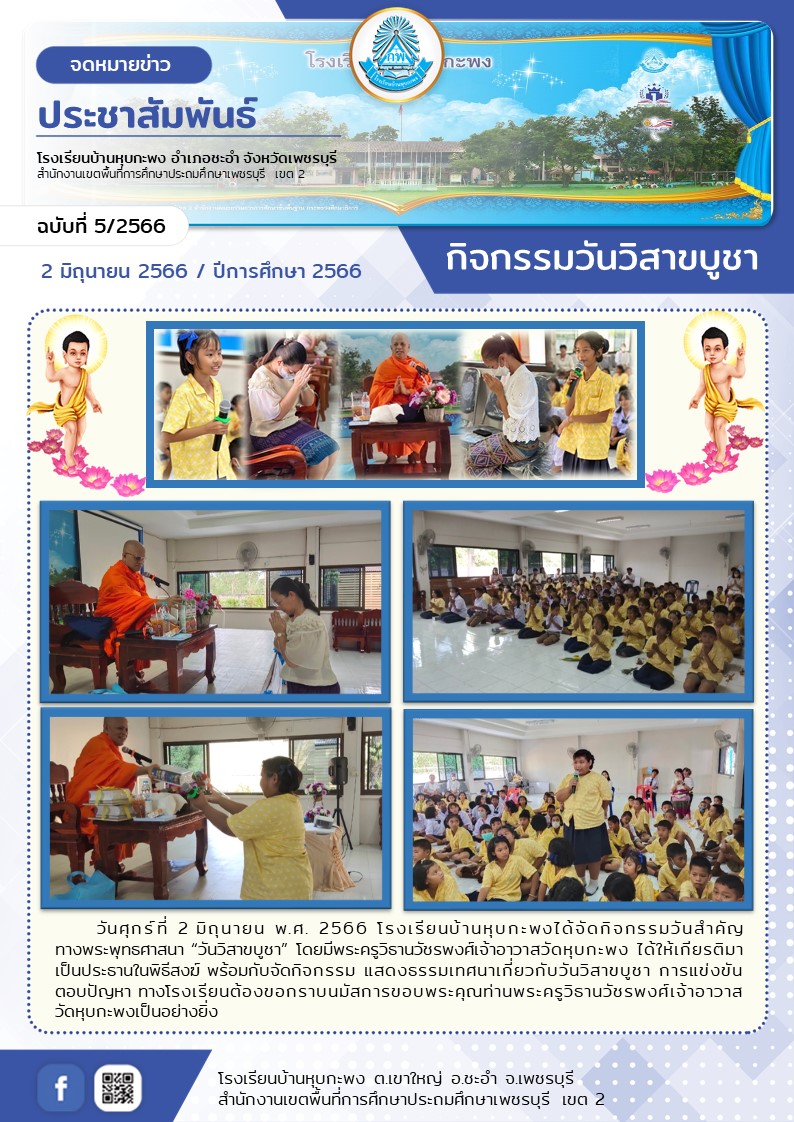 วันศุกร์ที่ 2 มิถุนายน พ.ศ. 2566 โรงเรียนบ้านหุบกะพงได้จัดกิจกรรมวันสำคัญ  ทางพระพุทธศาสนา “วันวิสาขบูชา” โดยมีพระครูวิธานวัชรพงศ์เจ้าอาวาสวัดหุบกะพง ได้ให้เกียรติมาเป็นประธานในพิธีสงฆ์ พร้อมกับจัดกิจกรรม แสดงธรรมเทศนาเกี่ยวกับวันวิสาขบูชา การแข่งขันตอบปัญหา ทางโรงเรียนต้องขอกราบนมัสการขอบพระคุณท่านพระครูวิธานวัชรพงศ์เจ้าอาวาส   วัดหุบกะพงเป็นอย่างยิ่ง