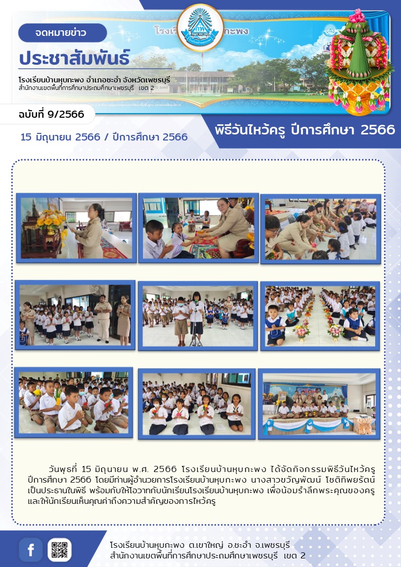 วันพุธที่ 15 มิถุนายน พ.ศ. 2566 โรงเรียนบ้านหุบกะพง ได้จัดกิจกรรมพิธีวันไหว้ครู ปีการศึกษา 2566 โดยมีท่านผู้อำนวยการโรงเรียนบ้านหุบกะพง นางสาวขวัญพัฒน์ โชติทิพยรัตน์ เป็นประธานในพิธี พร้อมกับให้โอวาทกับนักเรียนโรงเรียนบ้านหุบกะพง เพื่อน้อมรำลึกพระคุณของครู และให้นักเรียนเห็นคุณค่าถึงความสำคัญของการไหว้ครู