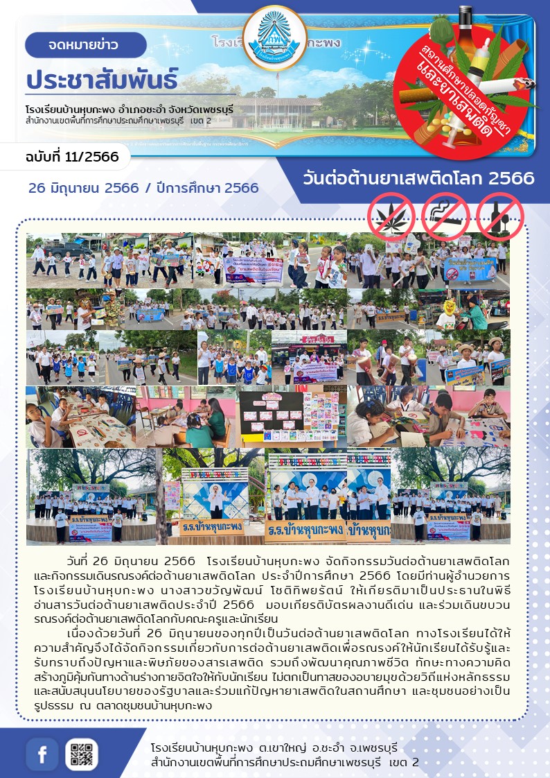 วันที่ 26 มิถุนายน 2566 โรงเรียนบ้านหุบกะพง จัดกิจกรรมวันต่อต้านยาเสพติดโลกและกิจกรรมเดินรณรงค์ต่อต้านยาเสพติดโลก ประจำปีการศึกษา 2566 โดยมีท่านผู้อำนวยการโรงเรียนบ้านหุบกะพง นางสาวขวัญพัฒน์ โชติทิพยรัตน์ ให้เกียรติมาเป็นประธานในพิธีอ่านสารวันต่อต้านยาเสพติดประจำปี 2566 มอบเกียรติบัตรผลงานดีเด่น และร่วมเดินขบวนรณรงค์ต่อต้านยาเสพติดโลกกับคณะครูและนักเรียน