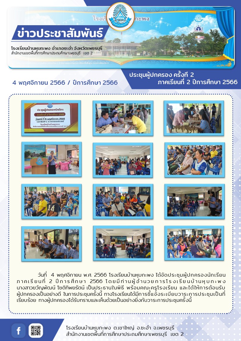 วันที่ 4 พฤศจิกายน พ.ศ. 2566 โรงเรียนบ้านหุบกะพง ได้จัดประชุมผู้ปกครองนักเรียนภาคเรียนที่ 2 ปีการศึกษา 2566 โดยมีท่านผู้อำนวยการโรงเรียนบ้านหุบกะพง นางสาวขวัญพัฒน์ โชติทิพยรัตน์ เป็นประธานในพิธี พร้อมคณะครูโรงเรียน และได้ให้การต้อนรับผู้ปกครองเป็นอย่างดี ในการประชุมครั้งนี้ ทางโรงเรียนได้มีการชี้แจ้งระเบียบวาระการประชุมเป็นที่เรียบร้อย ทางผู้ปกครองได้รับทราบและเห็นด้วยเป็นอย่างยิ่งกับวาระการประชุมครั้งนี้