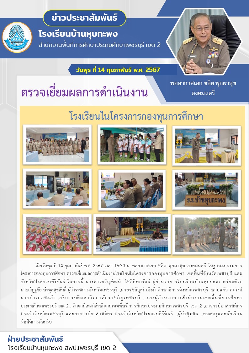 เมื่อวันพุธ ที่ 14 กุมภาพันธ์ พ.ศ. 2567 เวลา 16:30ใน. พลอากาศเอก ชลิต พุกผาสุข องคมนตรี ในฐานะกรรมการโครงการกองทุนการศึกษา ตรวจเยี่ยมผลการดำเนินงานโรงเรียนในโครงการกองทุนการศึกษา เขตพื้นที่จังหวัดเพชรบุรี และจังหวัดประจวบคีรีขันธ์ ในการนี้ นางสาวขวัญพัฒน์ โชติทิพยรัตน์ ผู้อำนวยการโรงเรียนบ้านหุบกะพง พร้อมด้วย นายณัฏฐชัย นำพูลสุขสันติ์ ผู้ว่าราชการจังหวัดเพชรบุรี ,นายรุซลัญน์ เจ๊ะมิ ศึกษาธิการจังหวัดเพชรบุรี ,นายแก้ว คงวงศ์ นายอำเภอชะอำ ,อธิการบดีมหาวิทยาลัยราชภัฏเพชรบุรี , รองผู้อำนวยการสำนักงานเขตพื้นที่การศึกษาประถมศึกษาเพชรบุรี เขต 2 , ศึกษานิเทศก์สำนักงานเขตพื้นที่การศึกษาประถมศึกษาเพชรบุรี เขต 2 ,อาจารย์อาสาสมัคร ประจำจังหวัดเพชรบุรี และอาจารย์อาสาสมัคร ประจำจังหวัดประจวบคีรีขันธ์m,ผู้นำชุมชน ,คณะครูและนักเรียนร่วมให้การต้อนรับ