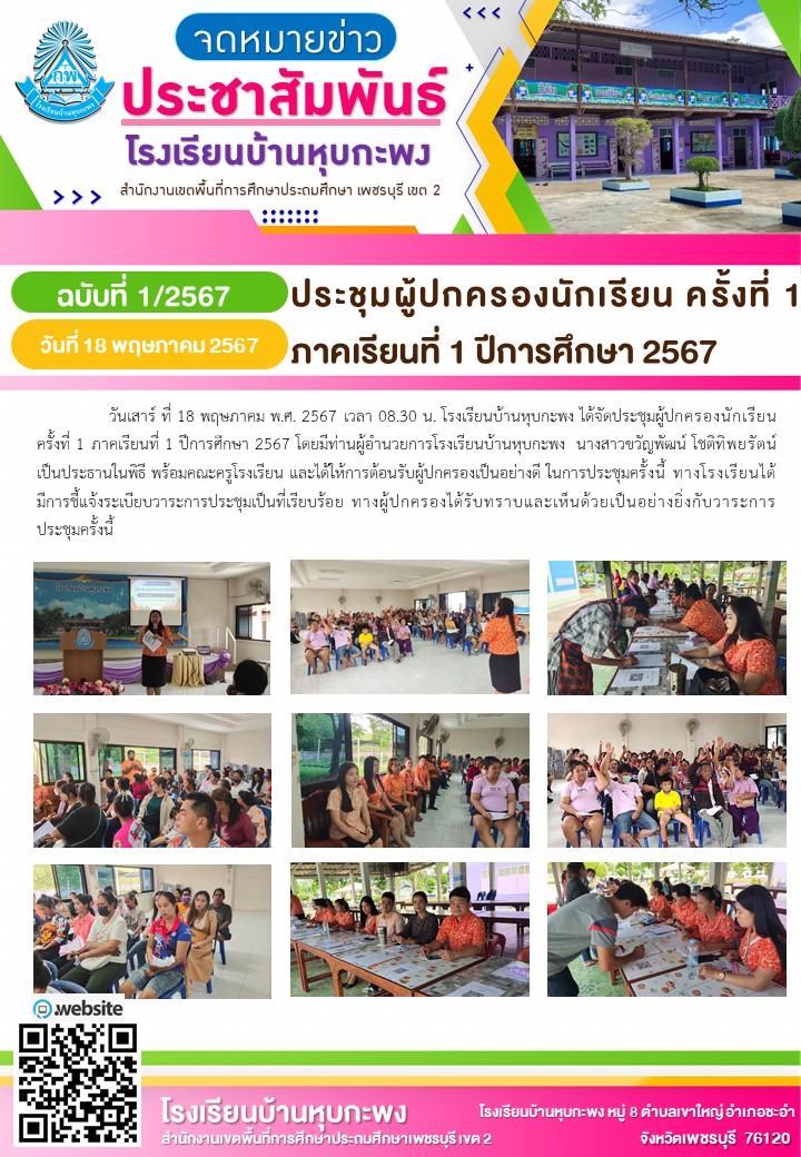 วันเสาร์ ที่ 18 พฤษภาคม พ.ศ. 2567 เวลา 08.30 น. โรงเรียนบ้านหุบกะพง ได้จัดประชุมผู้ปกครองนักเรียน ครั้งที่ 1 ภาคเรียนที่ 1 ปีการศึกษา 2567 โดยมีท่านผู้อำนวยการโรงเรียนบ้านหุบกะพง นางสาวขวัญพัฒน์ โชติทิพยรัตน์ เป็นประธานในพิธี พร้อมคณะครูโรงเรียน และได้ให้การต้อนรับผู้ปกครองเป็นอย่างดี ในการประชุมครั้งนี้ ทางโรงเรียนได้มีการชี้แจ้งระเบียบวาระการประชุมเป็นที่เรียบร้อย ทางผู้ปกครองได้รับทราบและเห็นด้วยเป็นอย่างยิ่งกับวาระการประชุมครั้งนี้