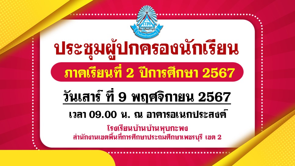 ด้วยโรงเรียนบ้านหุบกะพง ได้กำหนดให้มีการประชุมผู้ปกครองนักเรียน ในภาคเรียนที่ 2 ปีการศึกษา 2567 ในวันเสาร์ที่ 9 พฤศจิกายน พ.ศ. 2567 เวลา 08:00 - 11:00 น. ณ อาคารอเนกประสงค์โรงเรียนบ้านหุบกะพง โดยมีวัตถุประสงค์เพื่อสร้างความเข้าใจกับผู้ปกครองเกี่ยวกับแนวปฏิบัติในการจัดการเรียนการสอน และระเบียบต่างๆ ของทางโรงเรียน อันจะนำไปสู่ความร่วมมือในการพัฒนาศักยภาพด้านการศึกษา